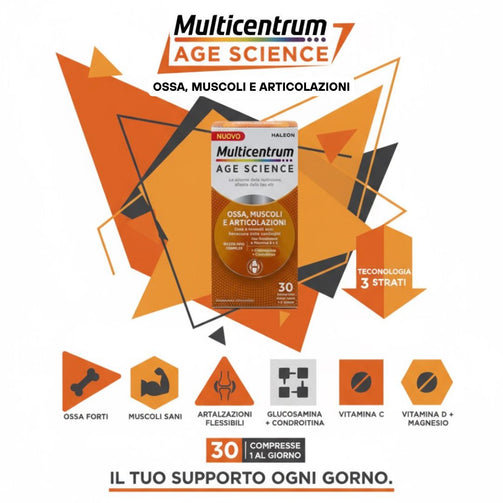 Proprio per rispondere a queste nuove esigenze nasce Multicentrum Age Science Ossa, Muscoli e Articolazioni: un integratore alimentare studiato per aiutarti a mantenere ossa forti, muscoli in salute e cartilagini flessibili.