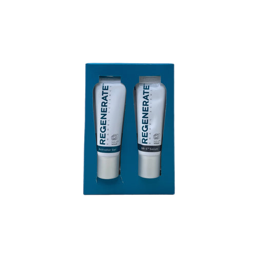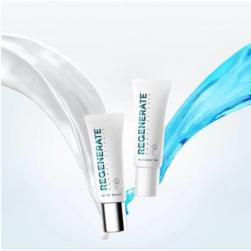 | Confezione: 1 Gel Attivatore 16 ml, 1 Siero NR-5 e due mascherine per l'applicazione del Siero REGENERATE e un bastoncino miscelatore. |