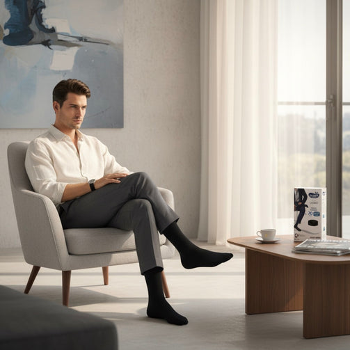 La compressione graduata 13–17 mmHg, massima alla caviglia e decrescente verso polpaccio e coscia, stimola la circolazione sanguigna, aiuta a prevenire capillari visibili e varici iniziali e riduce gonfiore, formicolii e senso di pesantezza.