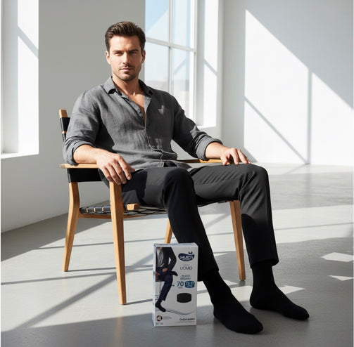 Le Calze Uomo Sauber 70 DEN in filato Dryarn® sono la scelta ideale per chi desidera gambe leggere, attive e toniche durante tutta la giornata. Progettate per offrire massaggio tonificante e prevenzione dei primi segni di insufficienza venosa, sono l’alleato perfetto per lavoro, sport, viaggio o per chi sta molte ore in piedi.