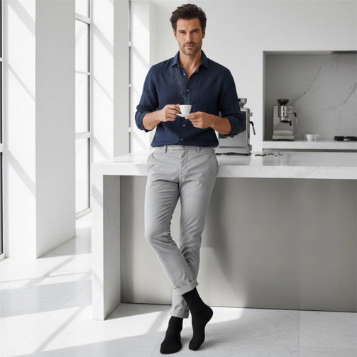 Le Calze Uomo Sauber 140 DEN in Dryarn® – colore Nero, sono la scelta ideale per l’uomo che pretende un supporto efficace, discreto ed estremamente confortevole per il benessere quotidiano delle gambe. Perfette per chi affronta giornate intense, molte ore in piedi o seduto, o per chi presenta varici ed edemi lievi.