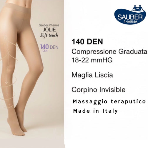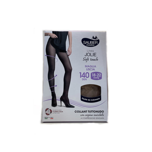 I Collant Jolie Soft Touch 140 DEN di Sauber Pharma sono la scelta ideale per chi desidera cura, comfort e stile discreto. Progettati per offrire un massaggio terapeutico efficace, migliorano la circolazione e regalano gambe leggere e toniche, con un corpino invisibile perfetto sotto ogni abito.