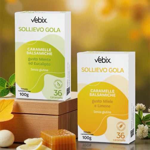 VEBIX Sollievo Gola Caramelle balsamiche gusto Menta ed Eucalipto sviluppano in gola prolungato benessere grazie un immediato e all'azione dell'olio essenziale di Eucalipto ed agli estratti di Timo, Altea e Mirto.
