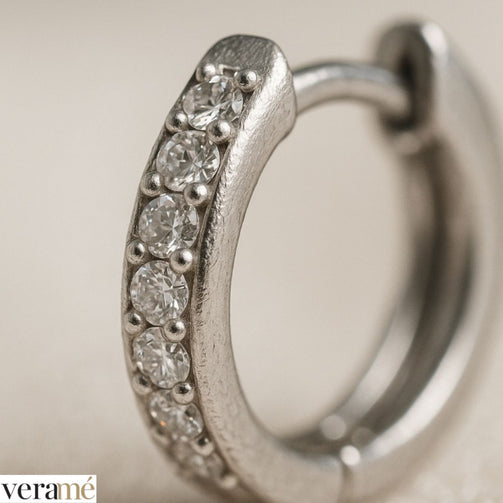 | Caratteristiche: Colore: Argento - Materiale del Gioiello: Ottone ipoallergenico - Materiale del Perno: Acciaio chirurgico 316L - Pietre: Zircone di alta qualità - Lunghezza perno: 8 mm - Diametro esterno: 13,3 mm - Dimensioni Pietre: 1,3 mm - Peso: 2,3g. |
