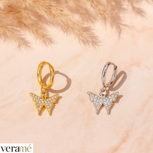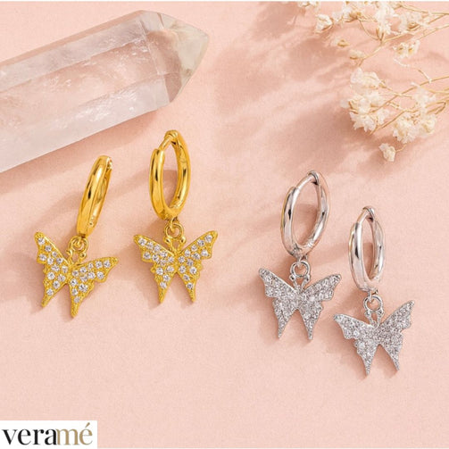 Il design è impreziosito da zirconi di alta qualità di 1,4 mm, che aggiungono un dettaglio di luminosità e raffinatezza al gioiello. Le farfalle pendenti catturano e riflettono la luce, creando un effetto delicato e incantevole.