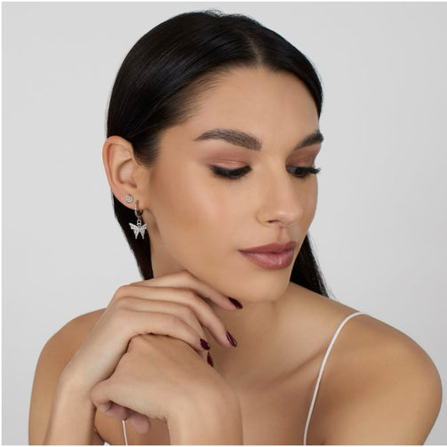 Il design è impreziosito da zirconi di alta qualità di 1,4 mm, che aggiungono un ulteriore livello di dettaglio e luminosità al gioiello. Le farfalle pendenti riflettono la luce in modo incantevole, creando un effetto scintillante che valorizza sia il gioiello che il viso di chi li indossa.